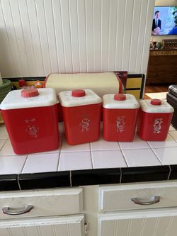Vintage 1950s Cope Plastic Atomic Red Canister Set – 4pc MCM USA$30Glendora, CA
