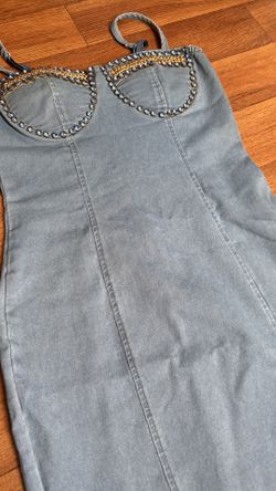 Light wash denim mini dress with a structured corset-style top. Features silver rhinestone detailing and gold chain accents.$22Brooklyn, NY
