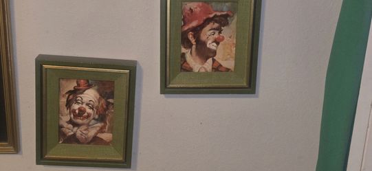 Two Framed pictures of clowns on green and gold vintage framed$15Krum, TX