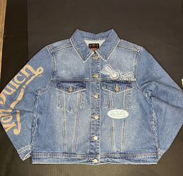 Von Dutch Originals Blue Denim Trucker Jacket Large Sleeve Logo Flying Eyeball L$87Allentown, PA