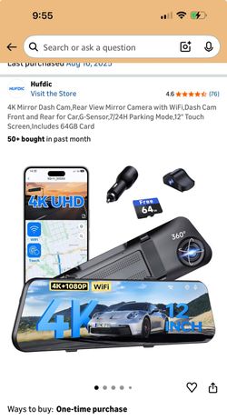 4K Mirror Dash Cam,Rear View Mirror Camera with WiFi,Dash Cam Front and Rear for Car,G-Sensor,7/24H Parking Mode,12" Touch Screen,Includes 64GB Card$45St. Louis, MO