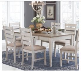 Farmhouse Medium Brown and Washed Stone Wood 66” Rectangular Dining Table + 6 Matching Chairs $295Oceanside, CA