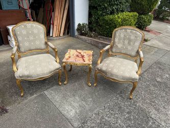 two gold and silver chairs with marble topped side table.$350San Francisco, CA