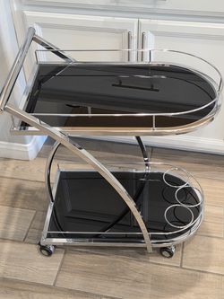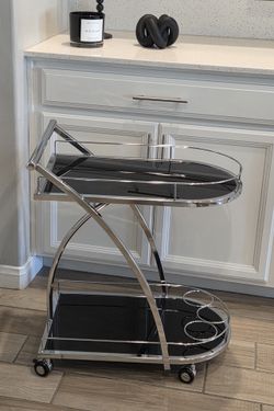 Modern 2-Shelve Chrome Silver Metal Black Rolling Kitchen Bar. Cart Glass With Wheels | 2 Shelf | Storage | Bar Cart. Used, in great condition.