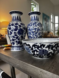 Extra Large Chinoiserie White And Blue Vases And Bowl$50Hialeah, FL