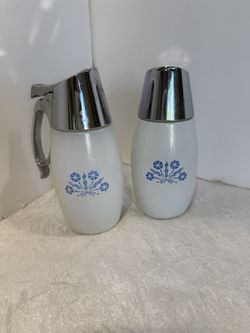 SoldVINTAGE GEMCO BLUE CORNFLOWER SUGAR CREAM SYRUP PITCHER METAL LIDS CORNING WARE made in USA used $45Garden Grove, CA