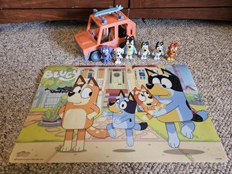 Bluey Family Vehicle With Surfboard And 6 Figures And A Placemat$30West Harrison, IN
