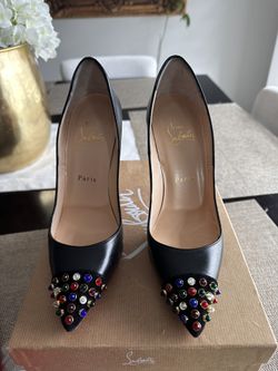 SoldCHRISTIAN LOUBOUTIN CABO PUMP 120 BLACK KID LEATHER / SUEDE TOE CAP WITH MULTI COLOURED JEWEL STUDS$300Imperial Beach, CA