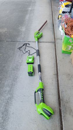 Powerful Greenworks 40V pole hedge trimmer. Has one 40V Lithium Max battery and charger. Good for reaching high hedges.