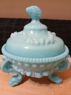 Vintage Argonaut Vallerystall lidded opeline blue shell milk glass. Minor chip in lid as noted in photo.$125Largo, FL