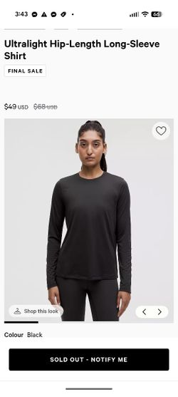EUC Lululemon Ultralight Hip-Length Long-Sleeve Shirt - Black, size 8$30Renton, WA