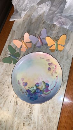 Vintage Floral Painted Plate & 4 Butterfly Napkin Rings Color Coordinating $25Winfield, IL