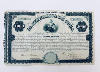 Emprestito (Bono) de 1,000 Pesos de la Republica de Cuba$800Miami, FL