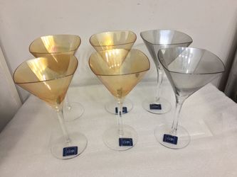mikasa panache Two platinum And Four Gold martini glass 8oz. France Lead Crystal. Elegant set of six martini glasses. Features gold and silver tones.$350Chicago, IL