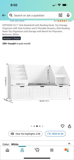 Kids Bookshelf with Reading Nook, Toy Storage Organizer with Seat Cushion and 3 Movable Drawers,$100Naples, FL