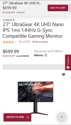 27" UltraGear 4K UHD Nano IPS 1ms 144Hz G-Sync Compatible Gaming Monitor$650Carlsbad, CA