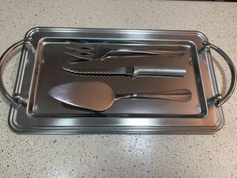 NEW Rectangular stainless tray with handles. Dimensions: 14" Length x 8" width. It comes with fork, cake server and knife. Otlher slightly used cookin$45Lewisville, TX