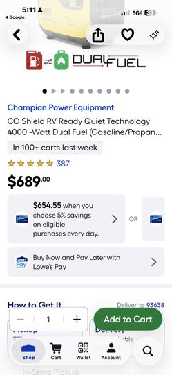CO Shield RV Ready Quiet Technology 4000 -Watt Dual Fuel (Gasoline/Propan...$580Madera, CA