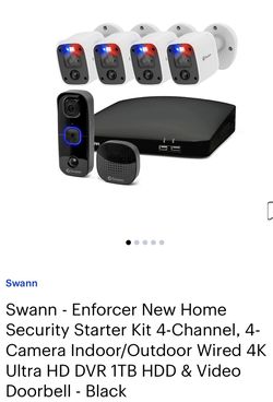 Swann - Enforcer New Home Security Starter Kit 4-Channel, 4-Camera Indoor/Outdoor Wired 4K Ultra HD DVR 1TB HDD & Video Doorbell - Black$350St. Louis Park, MN