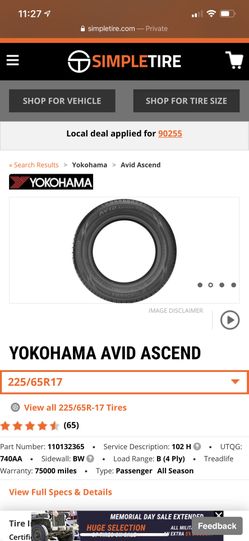 Yokohama 225/65R17 - Used$30South Gate, CA