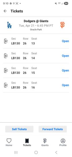 4 Tickets For Dodgers Vs Giants $320Campbell, CA