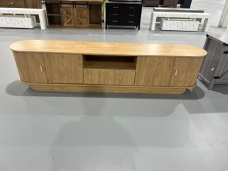 New 86.61'' Tambour TV Stand for 55-85 Inch, Modern Entertainment Center with Large Storage Cabinet & Open Shelves, TV Console with Sliding Doors for $195Morrow, GA