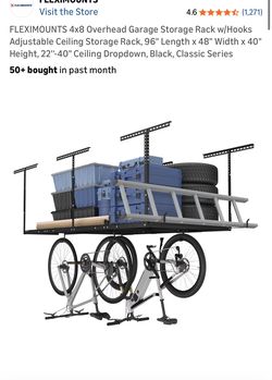 FLEXIMOUNTS 4x8 Overhead Garage Storage Rack w/Hooks Adjustable Ceiling Storage Rack, 96" Length x 48" Width x 40" Height, 22''-40" Ceiling Dropdown, $100Pompano Beach, FL