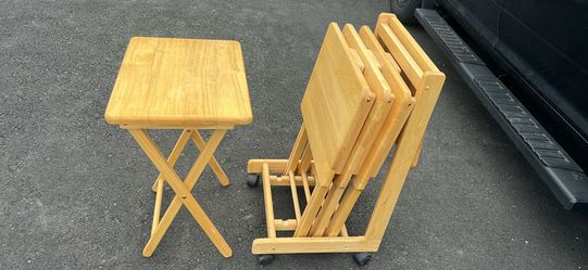 Good condition, folding solid wood tables with rolling stand$70Allentown, PA