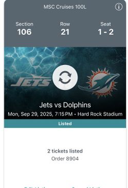 Miami Dolphins Vs NY Jets$150Oakland Park, FL