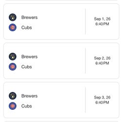 Cubs Vs Brewers - September 1-3$150Frankfort, IL