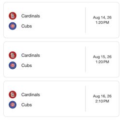 Cubs Vs Cardinals- August 14-16$250Frankfort, IL