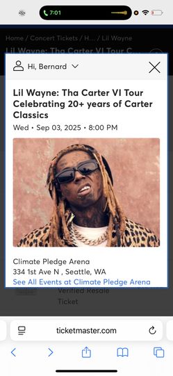 Lil Wayne Floor Level Tickets (row 18). 9/3/25$150Lynnwood, WA
