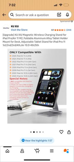 KU XIU Magnetic Wireless Charging Stand for iPad Pro/Air 11 M2, Foldable Aluminum Alloy Tablet Holder Mount for Desk, Adjustable Tablet Stand for iPad$65Gardena, CA