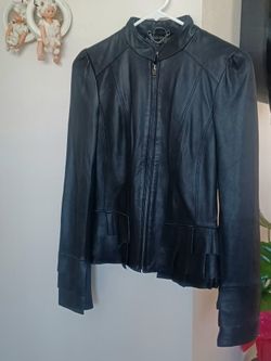 OASIS Butter Soft GENUINE LEATHER Black Ruffle Jacket Polyester Lining X-SMALL $60Monterey Park, CA