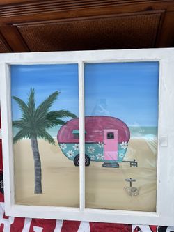 Old Vintage Window Hand Painted With Camper On The Beach $50Myrtle Beach, SC