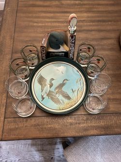 Vintage Jim Bean decanter empty with 8 glass Mallard glasses and tray$40El Cajon, CA