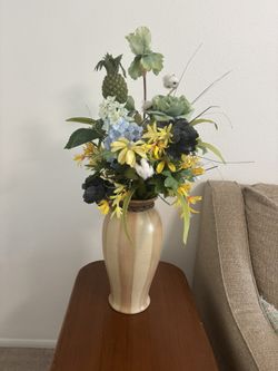 Pottery vase with two color schemes with weaved band at top 15” tall, base is 5.5 w flowers included$35Fort Myers, FL