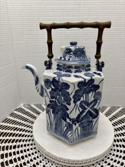 chinoiserie oriental hexagon blue/ white floral porcelain tea pot brass handle$50Fort Myers, FL