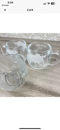 Vintage NESTLE NESCAFE Etched Clear Glass World Globe Map Coffee Mugs & Sugar & Creamer$100Sully Station, VA