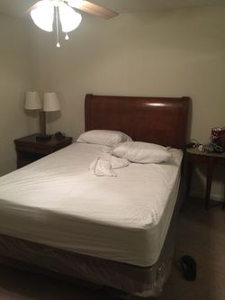 7 pieces Mild walnut solid wood queen bed frame set with mattress and box spring, accompanied by a small vintage table with a granite top in antique s$1,000Fleming Island, FL