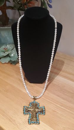 VTG Artisan Pearl & Turquoise Beaded Cross Necklace $35Yuma, AZ