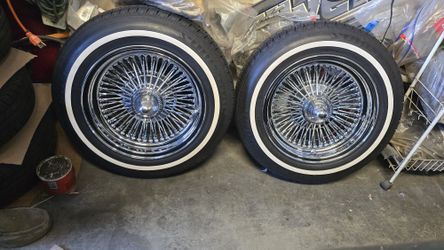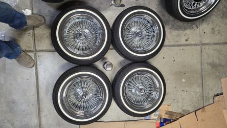 72 Spoke Wire Wheels 14 Inch Whitewall Tires 5 Lug Universal Like New Rims & Tires Lowrider Rims $ Trade Tru Spoke Cragar Supreme Roadster Zenith Wire$1,300Dinuba, CA