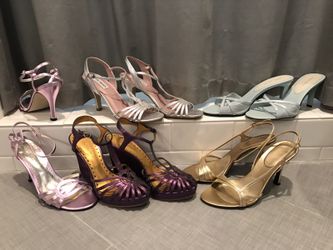 Lot 5 pairs bcbgirls, Steve Madden, Nine West, caparros metallic strappy sandals wedding prom wedge stiletto pink purple gold silver blue sz 7$75Bothell, WA