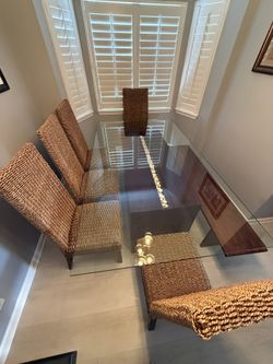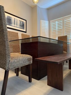 Large Custom Design Dining Glass Table with Center Stones + Rich Dark Wood Base and 5 Banana Leaf Rattan Chairs with Matching Bench$850Fort Lauderdale, FL