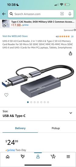 UHS-II SD 4.0 Card Reader, 2 in 1 USB A & Type-C SD 4.0 Memory Card Reader for SD Micro SD SDXC SDHC MMC RS-MMC Micro SDXC UHS-II and UHS-I Cards$10Federal Way, WA