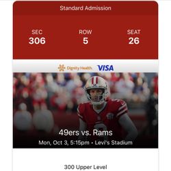 One (1) Ticket 49ers Vs Rams Monday Night 10/3$100Pinole, CA