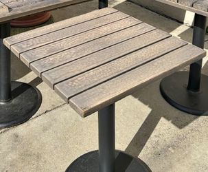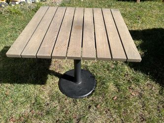 Bistro BarPub height Square Wood Top Patio Table. Sturdy square table. Has wood slatted top and black metal pedestal base. Great for outdoor use on a $120Lodi, CA