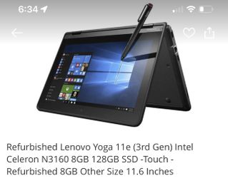 Lenovo Yoga 11e (3rd Gen) Intel Celeron N3160 8GB 128GB SSD -Touch - Refurbished$299Boynton Beach, FL