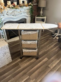 Collapsible ironing board cart with three wicker baskets and laundry hamper$40Menifee, CA