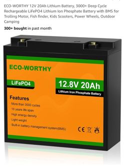 ECO-WORTHY 12V 20Ah Lithium Battery, 3000+ Deep Cycle Rechargeable LiFePO4 Lithium Ion Phosphate Battery with BMS for Trolling Motor, Fish finder, Kid$45Los Angeles, CA